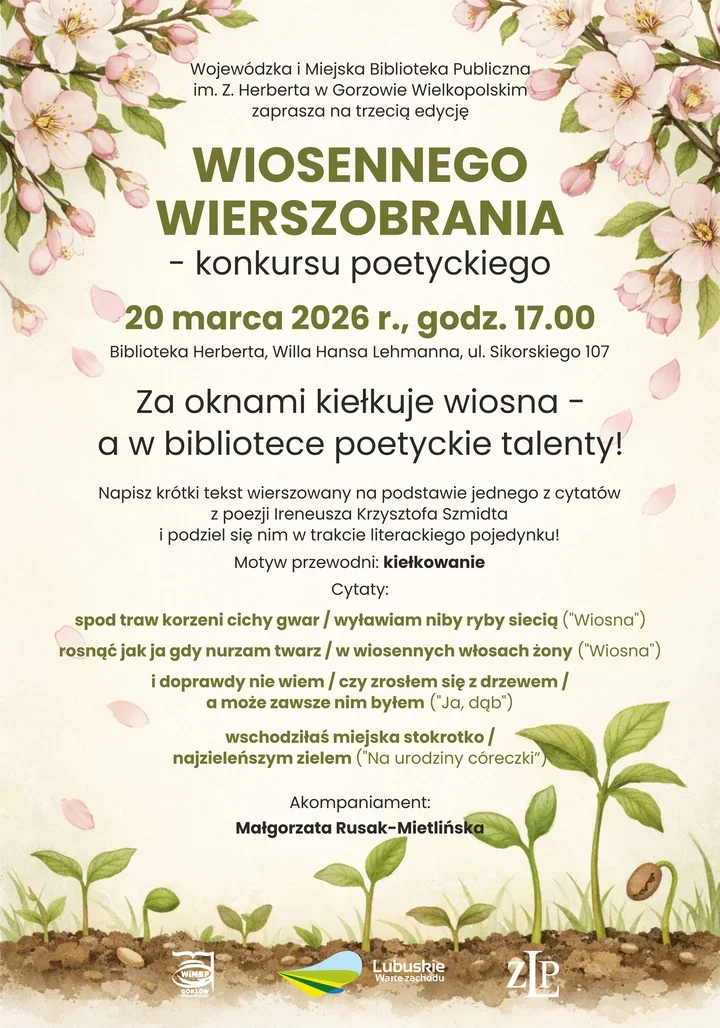 Wiosna puka do okien Biblioteki Herberta, a bibliotekalne wnętrza zamieniają się w arenę dla krótkich, ostrych wierszy. Warto zajrzeć na Willę Hansa Lehmanna i posłuchać, jak kiełkują nowe głosy w Gorzowie Wielkopolskim. 🙂