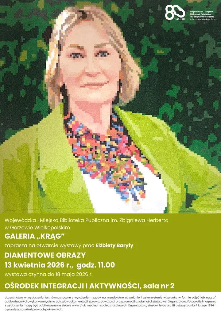 „Diamentowe obrazy” to tytuł wystawy prac Elżbiety Baryły, którą będzie można zobaczyć w Bibliotece Herberta, ul. Sikorskiego 107, w Ośrodku Integracji i Aktywności, Galeria Krąg. Wernisaż zaplanowano na 13 kwietnia 2026 r. o godz. 11.00.