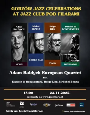 W klubie Pod Filarami odbędzie się koncert Adama Bałdycha z zespołem European Quartet w ramach cyklu Gorzów Jazz Celebrations. Wydarzenie to skierowane jest do miłośników współczesnego jazzu i instrumentów smyczkowych w tej stylistyce; występ zaplanowano jako kameralny koncert klubowy.